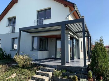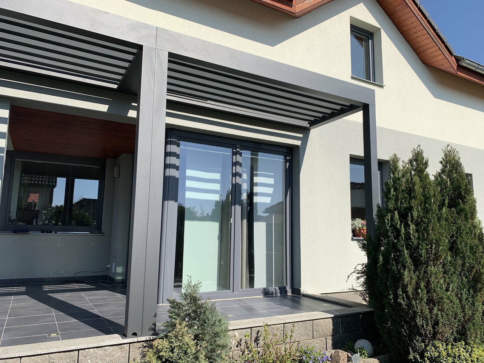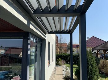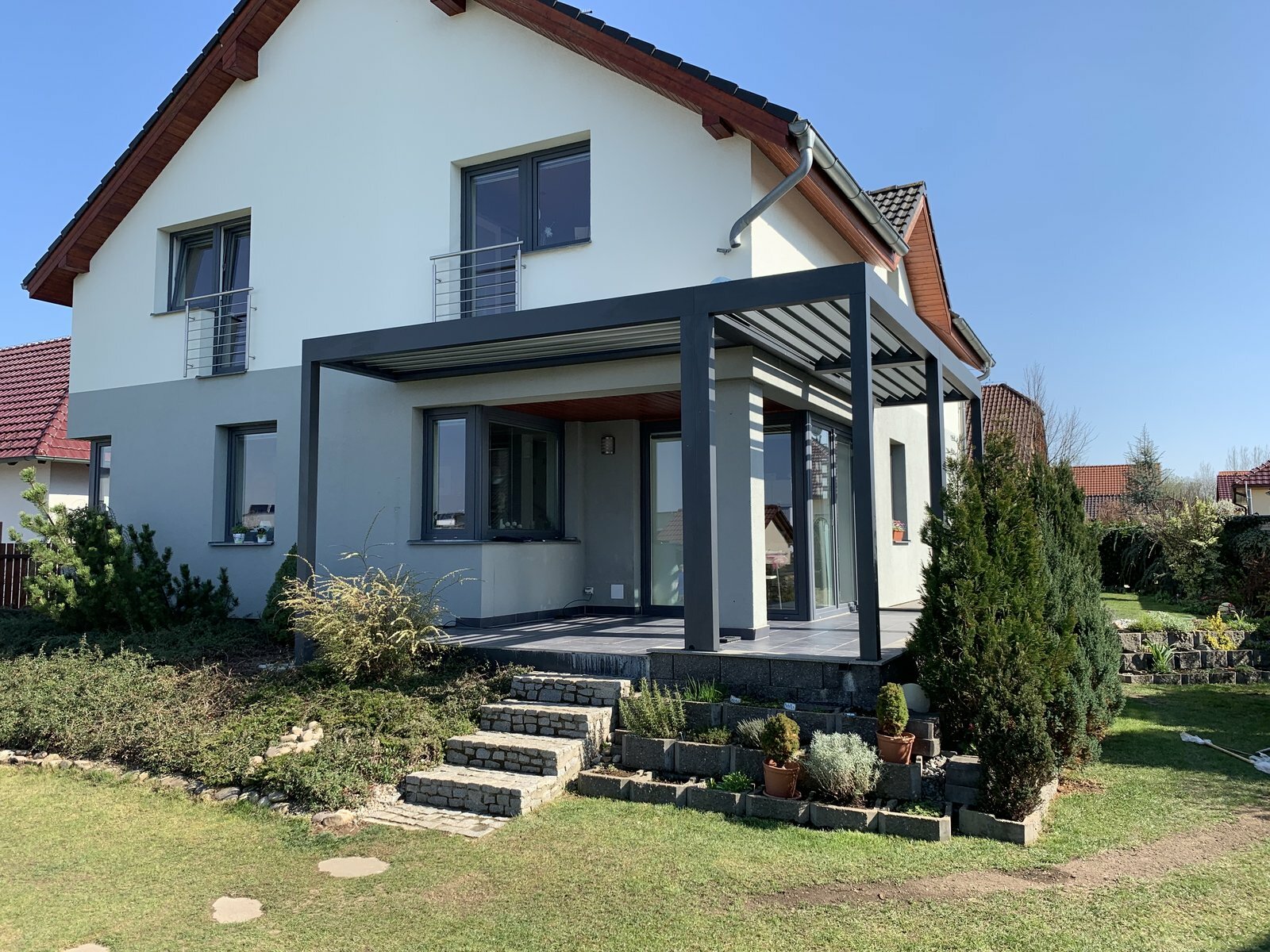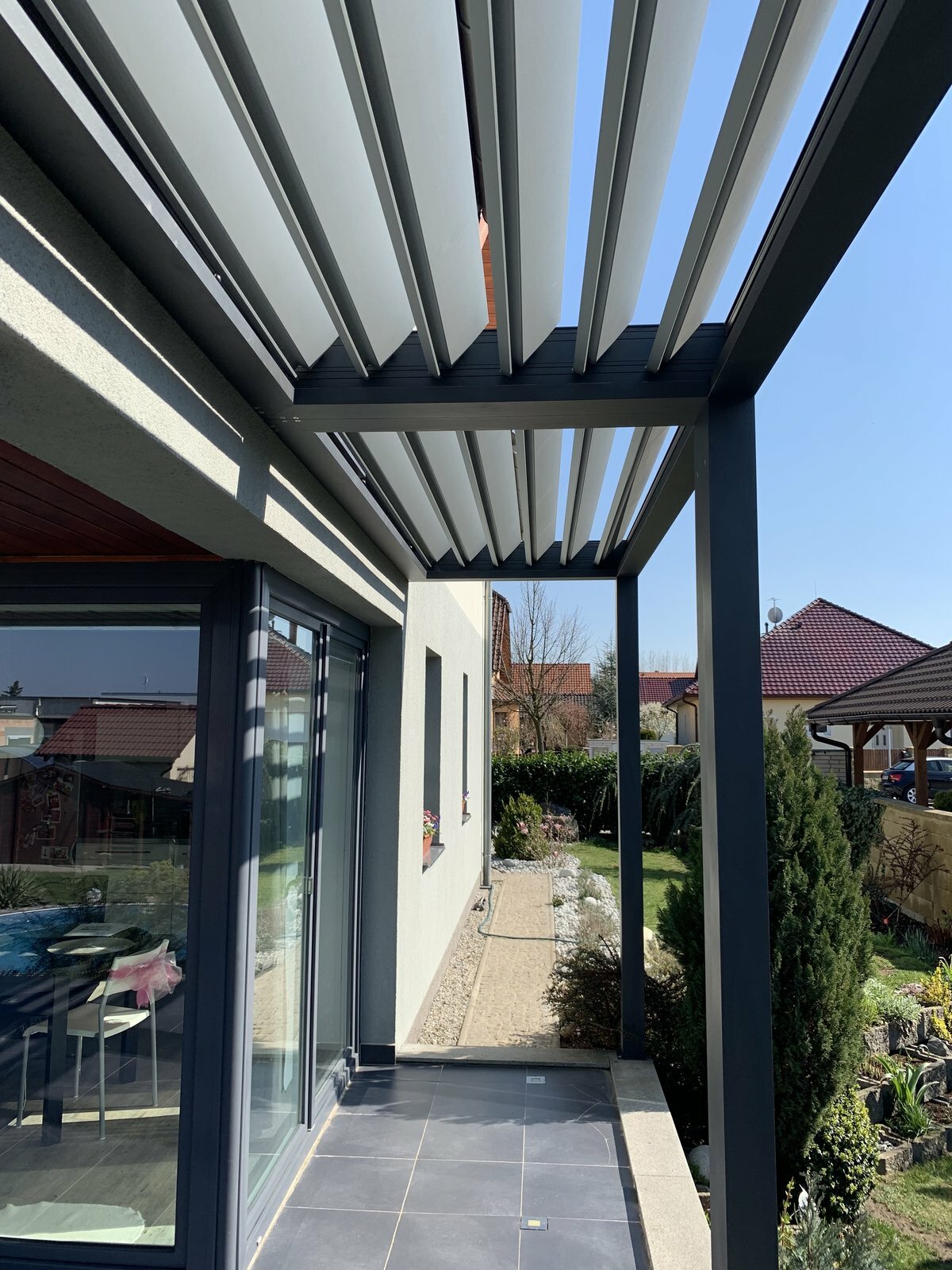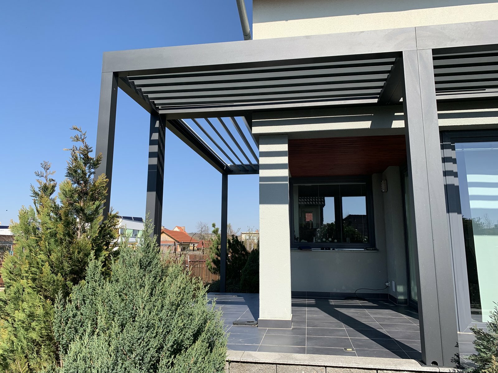 Sestava 3 ks bioklimatickcýh pergol (přes roh rodinného domu)  - 1,34 x 3,00 bm,  1,34 x 3,00 bm a 1,34 x 4,2 bm. Střešní systém s hliníkovými naklápěcími lamelami, integrovaným odvodem vody. Ovládání pohonem SOMFY IO. Barva konstrukce DB 703 metalic, barva lamel stříbrná RAL 9006.